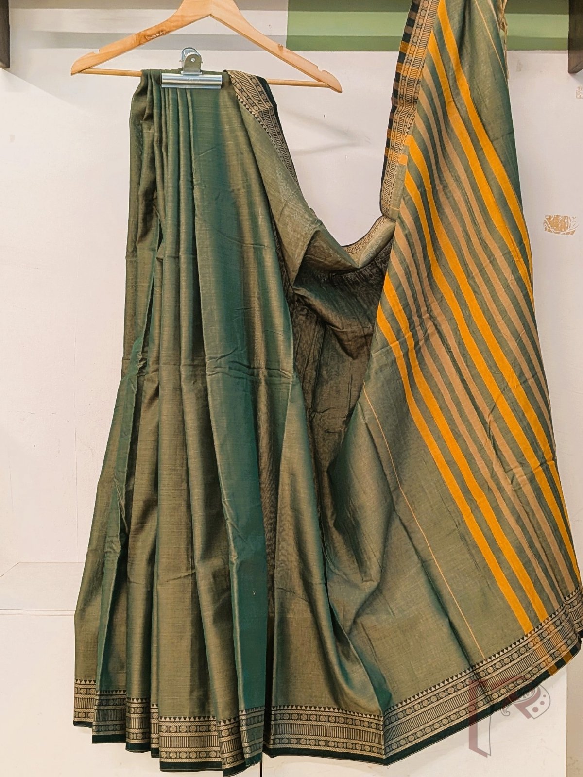 Ilkal Heritage – Olive Green Mercerized Cotton Ilkal Saree with Temple Border and Orange-Beige Striped Pallu