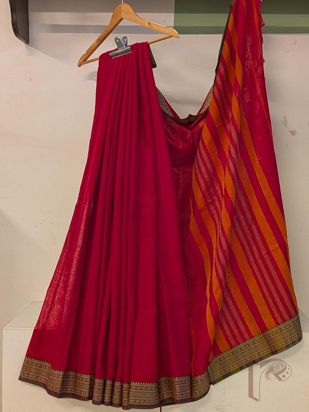 Ilkal Heritage – Tomato Red Mercerized Cotton Ilkal Saree with Light Green Selvage and Orange-Green Striped Pallu