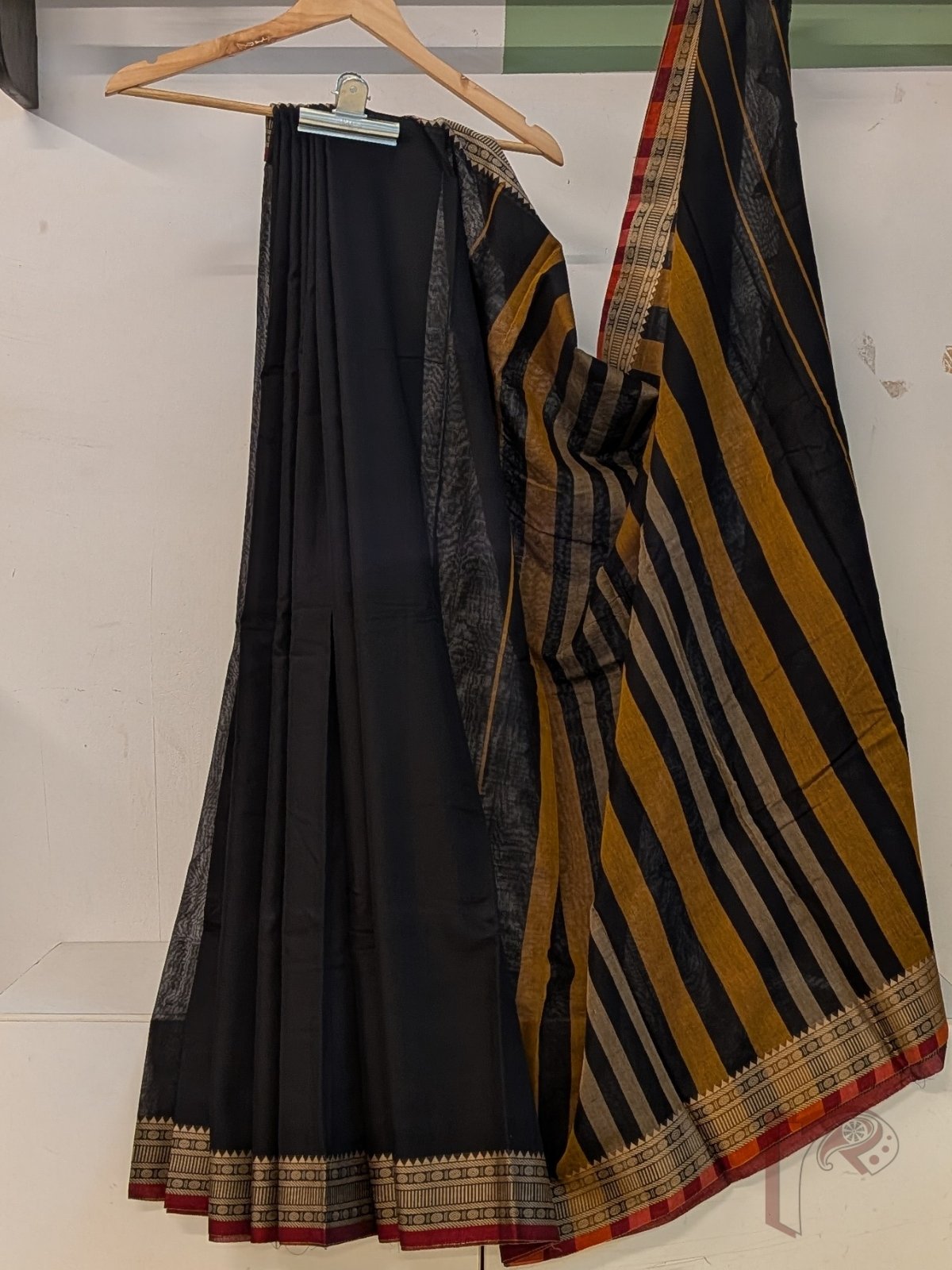 Ilkal Heritage – Black Mercerized Cotton Ilkal Saree with Maroon Selvage and Orange-Grey Striped Pallu